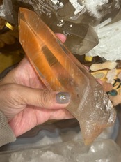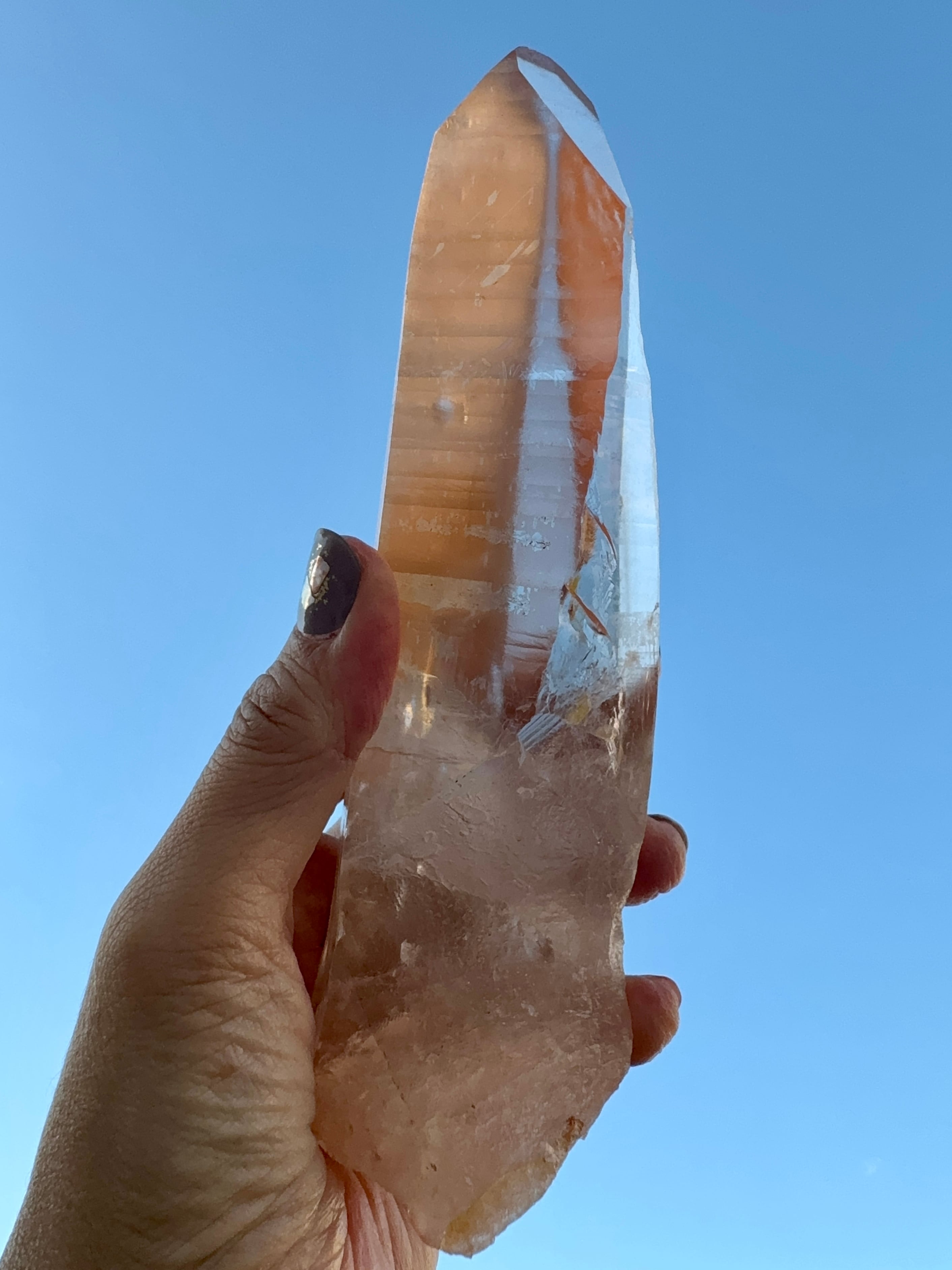 このレムリアンシードを手に取るとまず感じるのは、温かな色味と結晶の力強さ、透明度の高さと光の通り方の美しさ。内部には清らかな光の道が通り、角度によっては淡くオレンジゴールドに煌めきます。
