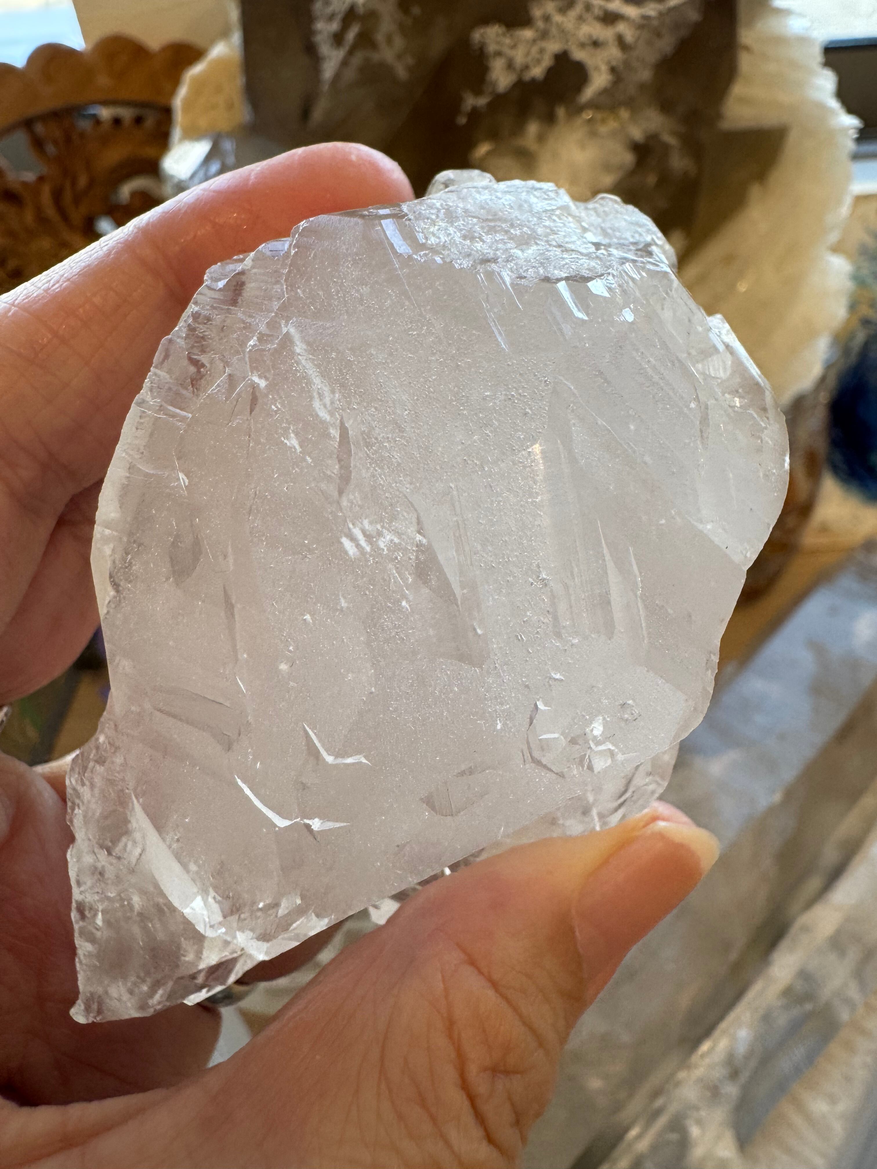 光を当てたときに内部で濁らず、奥まで素直に通り、結晶の芯がはっきり感じられるものだけを選んでいます。表面には自然な蝕像が見られる個体もありますが、成長と環境変化を経た証であり、透明感の高い結晶にその質感が重なることで、単なる「クリア」では終わらない深みが生まれます。