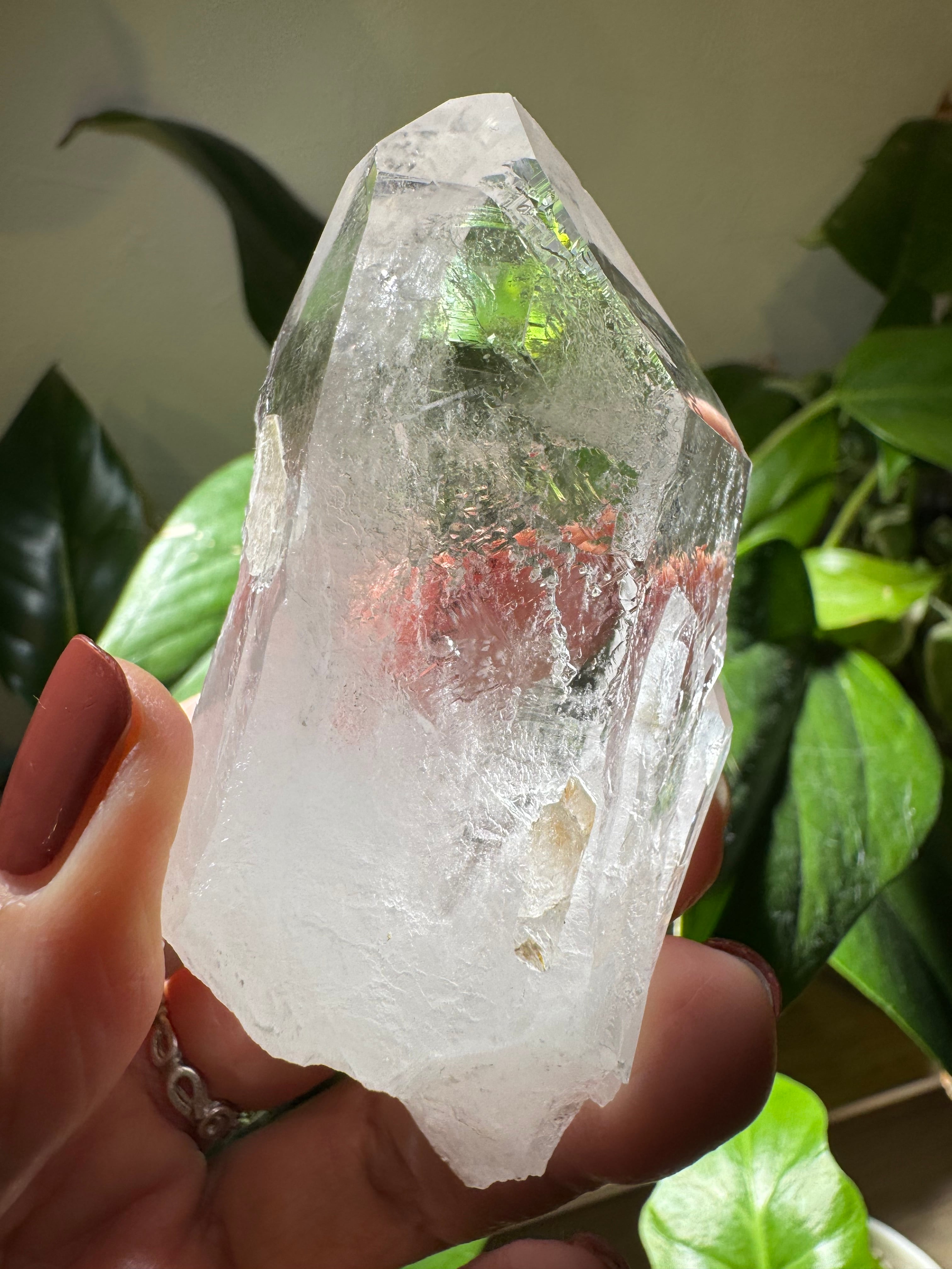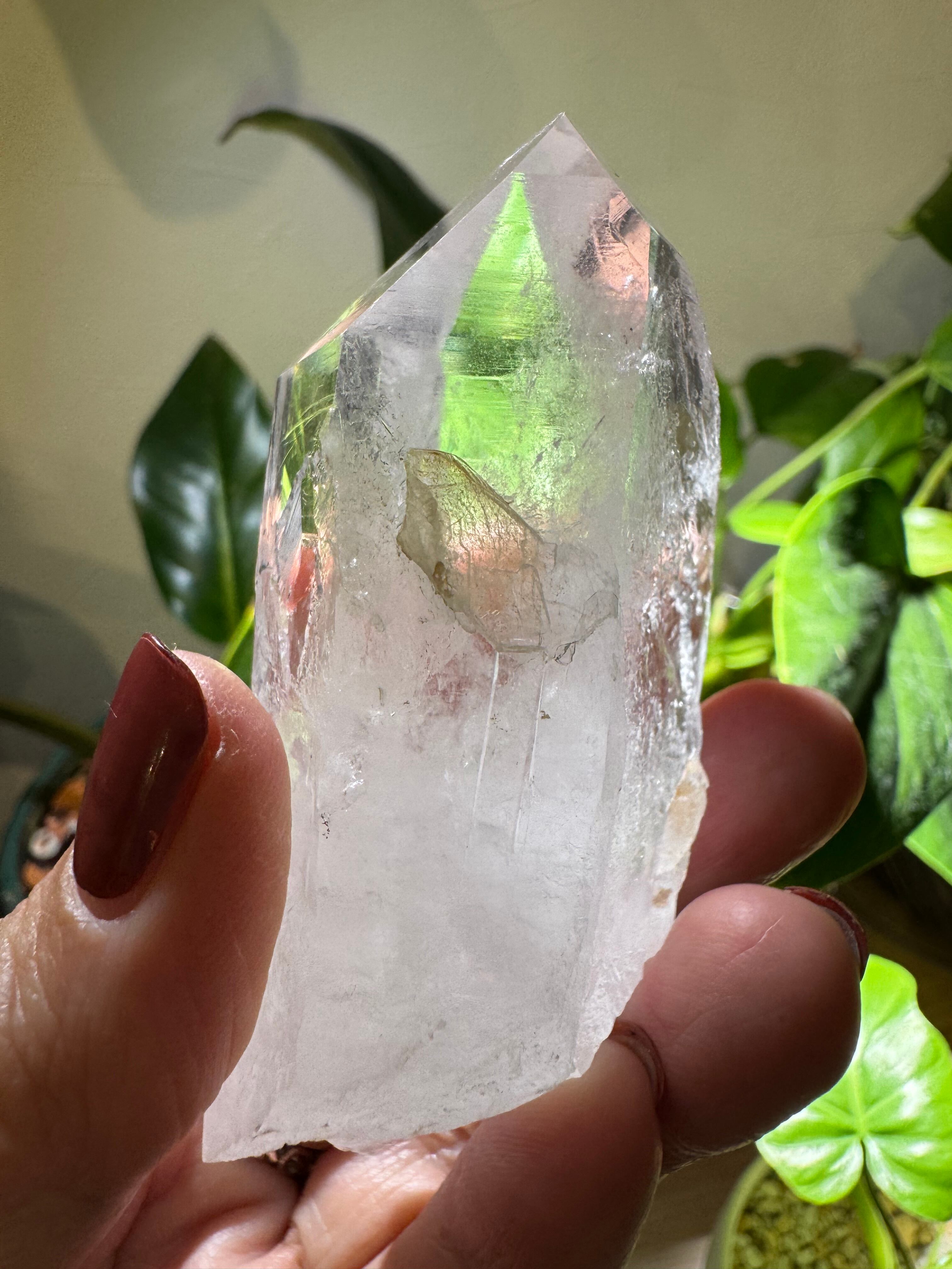 内部には、細かく砕けたような成長痕や再結晶の跡が見られ、光を通すことで層状に重なった反射が浮かび上がります。モンドクォーツらしい原始的な魅力そのもの。結晶面はシャープで、ポイントとしての造形も美しく整っています。